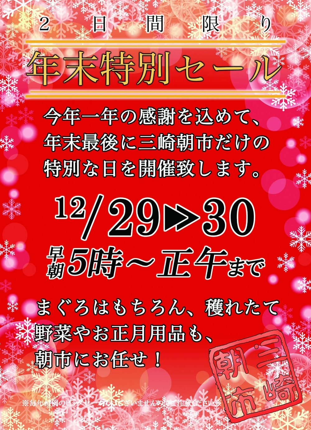 12月29日(月)と30(火)の2日間は、年末特別開催の為、AM5:00〜昼12:00まで開催出店いたします。